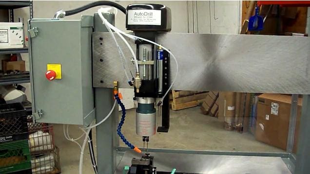 The Series 2000 AutoDrill and multiple spindle head shown in the photo were provided to a major gun manufacturer.  The customer wanted to drill closely spaced holes, two at a time in the end of a gun barrel. Of course, AutoDrill was able to provide this rifle barrel drill that worked perfectly for their operation.