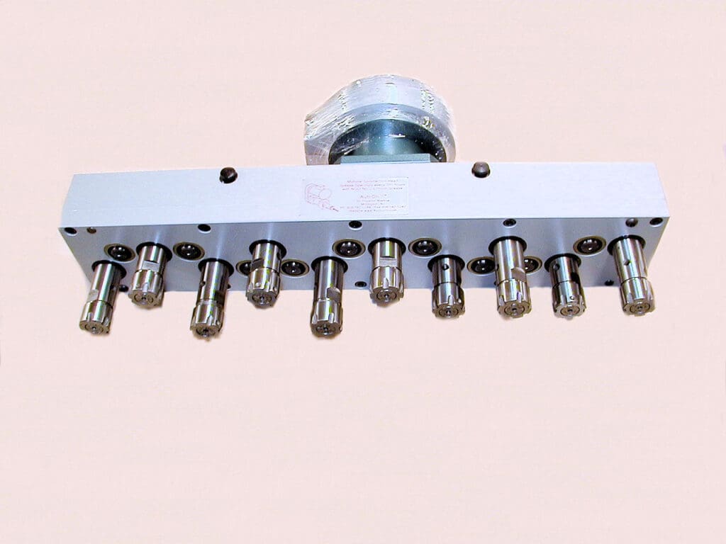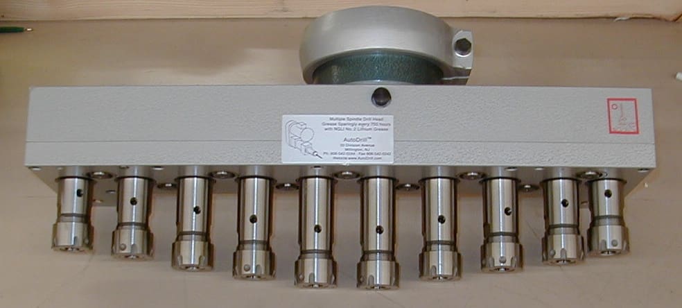 When the suggested RPM for the different size tools is significantly different, the chance for tool breakage and other issues exists. Our multiple head designs can solve many of the problems of drilling two or more different size holes. Custom designed multiple spindle heads do not require any tool changes since two separate tools can remain in the spindles yet run at different RPM rates. Running each tool closer to its optimum speed also increases the tool life because it changes the amount of material taken out per rotation as well. When drilling different size holes simultaneously with a Multiple Spindle Drilling Head, the spindles can often be made to different lengths to compensate for tooling length differences. in many cases, this will keep the side loads on the drilling head and the tooling to a minimum. By controlling the side loads, smaller tooling is less likely to be broken off in the chuck. It also often allows for drilling straighter holes and drilling more precise patterns.