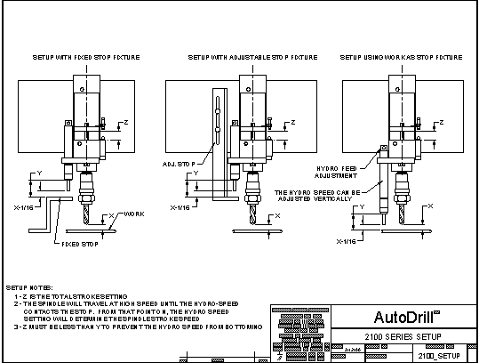 The Series 2100 AutoDrill is based on the Series 2000 unit with the addition of a plunger-style Hydro Speed feed cylinder. This addition overcomes the limitation of simple pneumatic feed control. The two-speed feed rate is standard. The Hydro Speed (sometimes called Hydra-Brake) controls the critical work penetration feed rate and breakthrough process. Check out our videos section for examples of a Hydro Speed in use or see the simple animation below which shows a basic 2100 Series Self-Feed AutoDrill stroking.