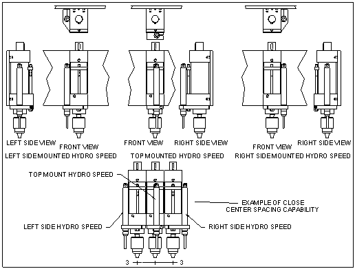 The Hydro Speed can be provided in multiple locations. This flexibility is appreciated when drilling closely spaced holes or on special projects where flexibility is critical. It also simplifies maintenance since it can be repositioned or replaced without disturbing the AutoDrill body. The diagram below displays the basic optional locations. (The right side on the self-feeder is always standard)