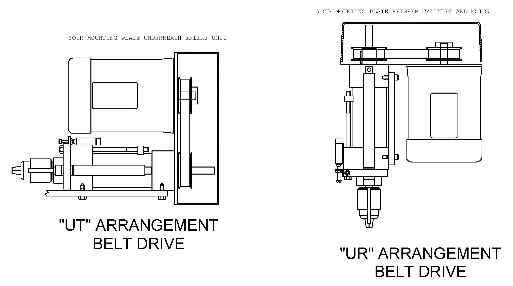 These are the most common configurations. “UT” is used most often for horizontal drilling and “UR” generally for vertical. The motor is generally configurable in four positions with this mounting plate. Custom positions are also available upon request.